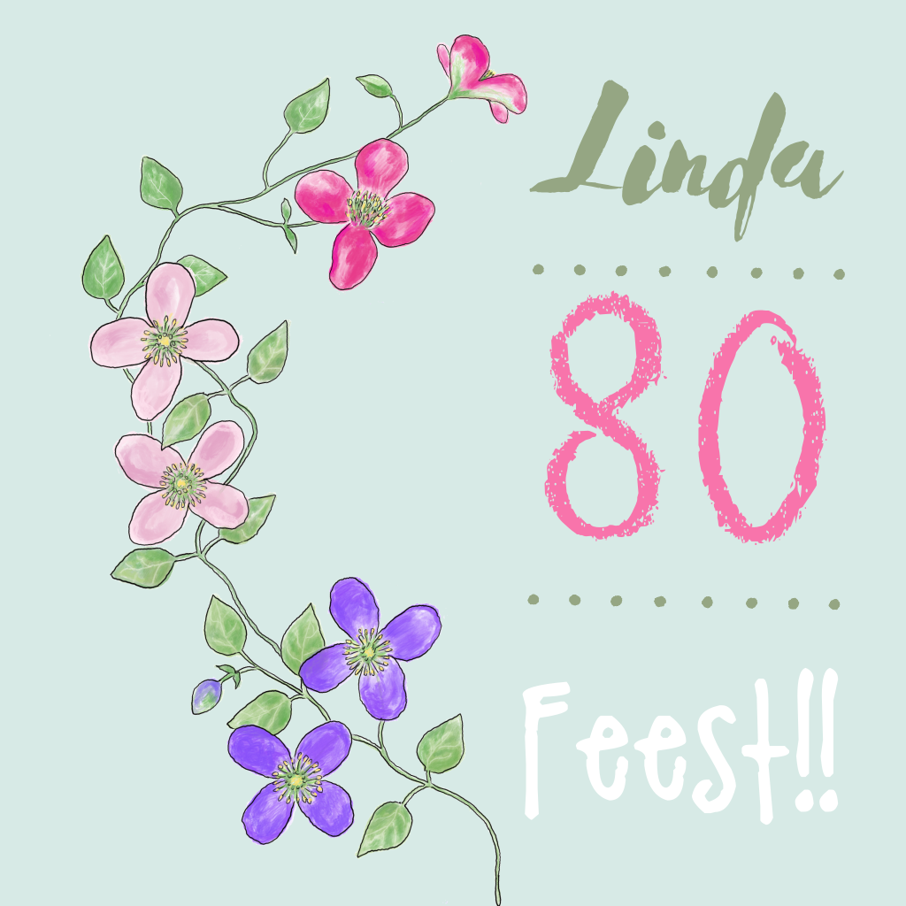Een frisse verjaardagsuitnodiging voor een 80 jarige met mooi getekende bosrank. De achtergrondkleur is eenvoudig aan te passen in onze kaartenmaker. (7496)