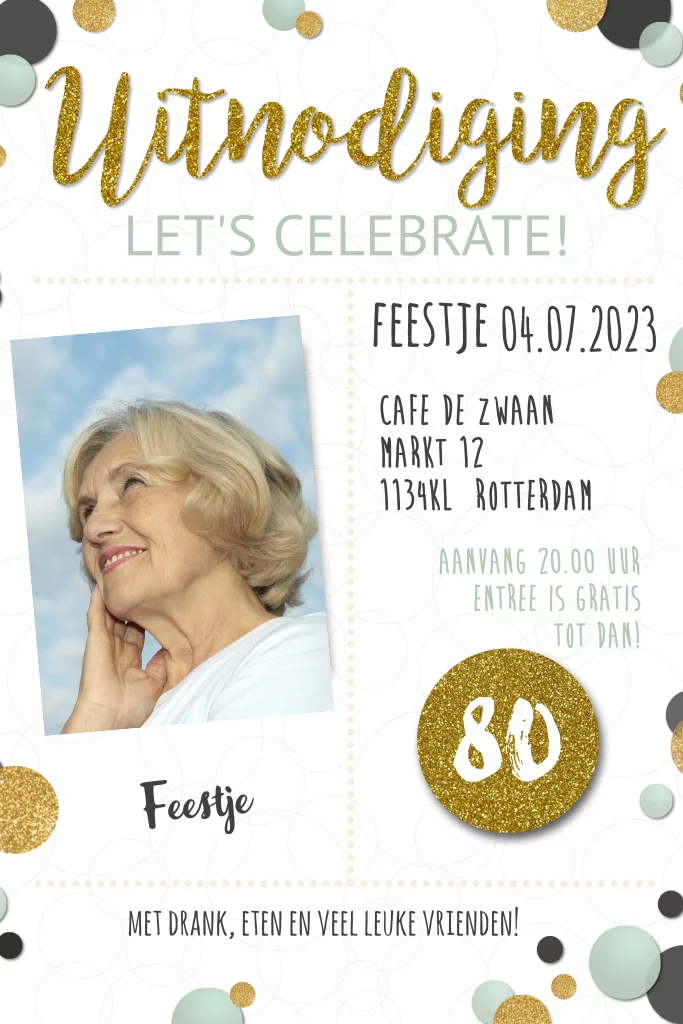 Uitnodiging feestje 80 jaar met confetti in wit enkel. (6337)