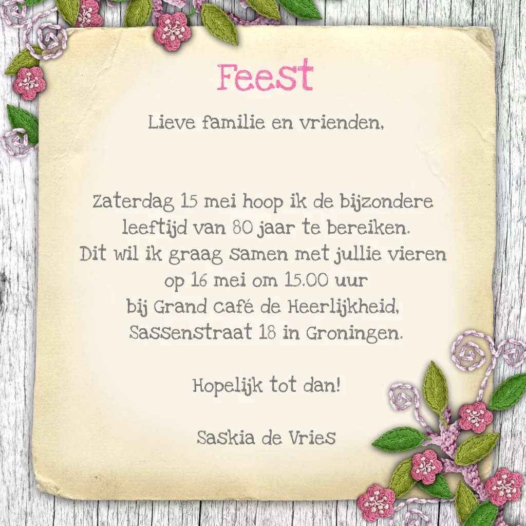 Uitnodigingskaart voor een tachtig jaar feestje bloemen en vlinders op een houten achtergrond.