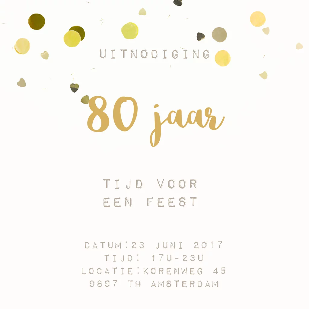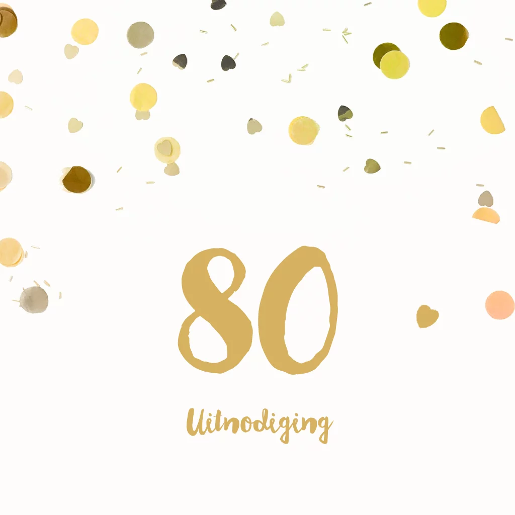 Uitnodiging 80e verjaardag met goudkleurige confetti met de tekst in goudkleur. (5064)