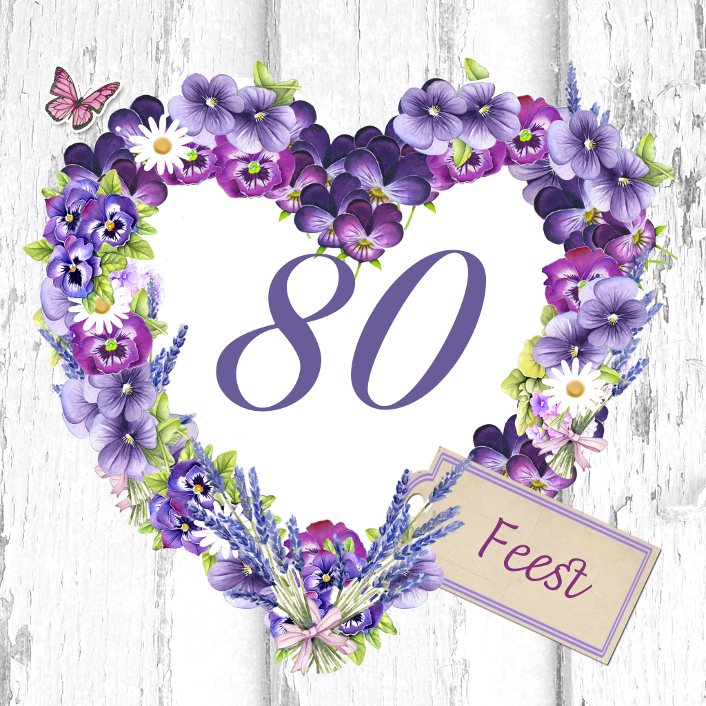 Uitnodiging 80e verjaardag hout met hart van paarse bloemen