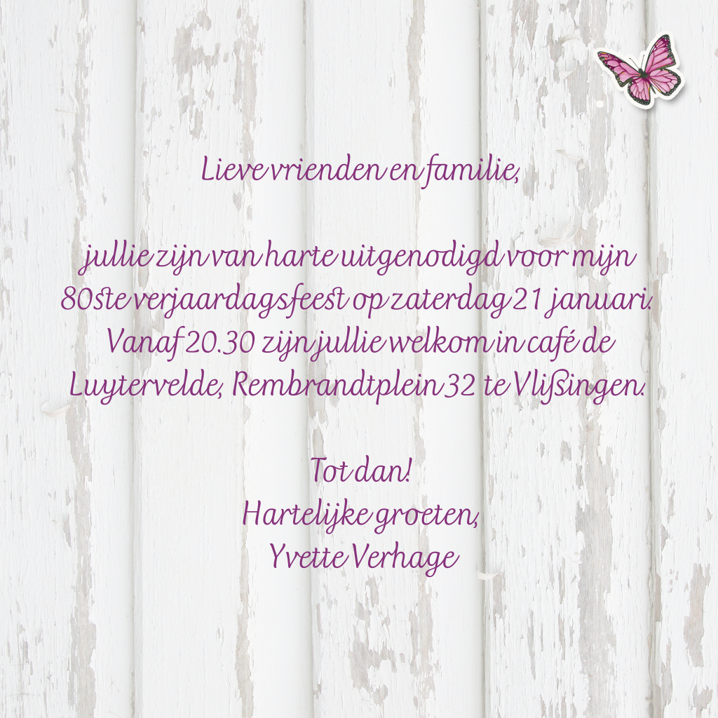 Uitnodiging 80e verjaardag hout met hart van paarse bloemen. Vlindertjes. (720)