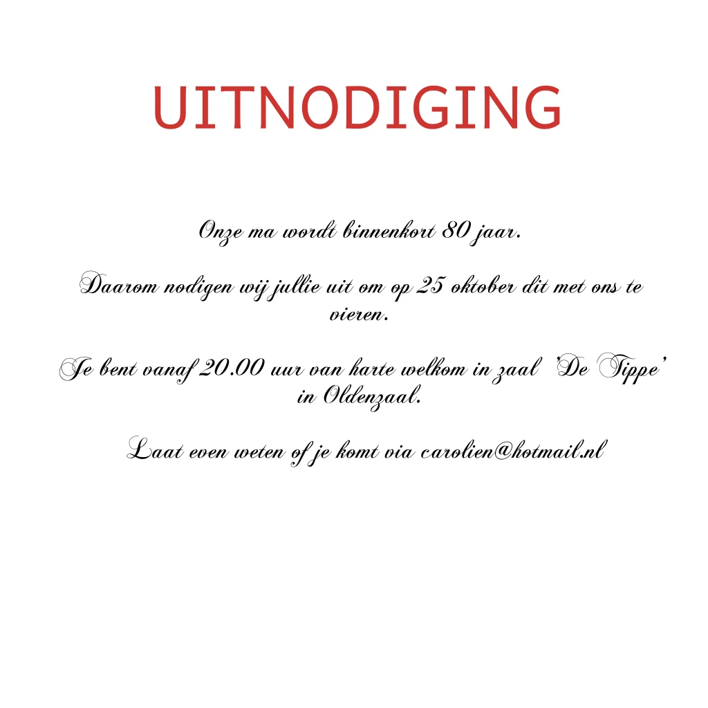 Uitnodigingskaart voor een tachtigste verjaardagsfeest