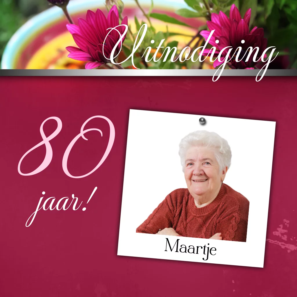 Uitnodigingskaart feestje 80 jaar verjaardag bloemen