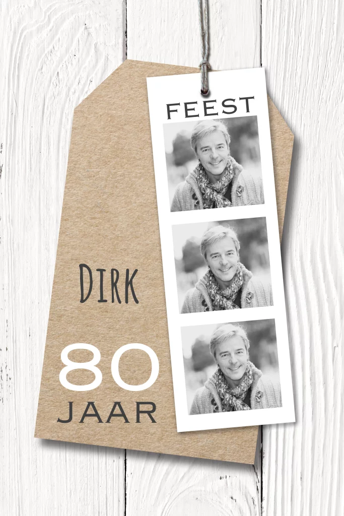 Verjaardag 80 jaar uitnodiging wit hout kraft label met ruimte voor drie eigen foto's aan een label (geprint label). (3294)