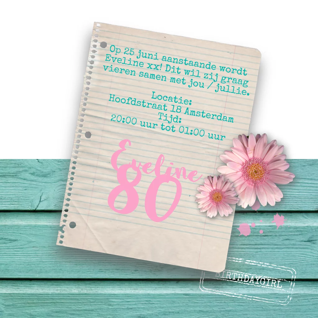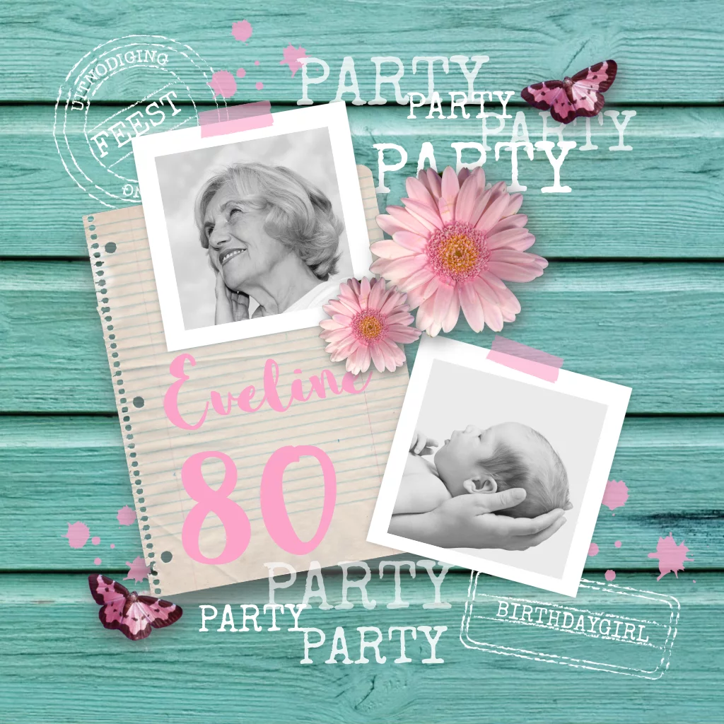 Een leuke, originele uitnodiging voor een 80e verjaardagsfeest, met bloemen, vlinders, houtlook en foto's. (5010)