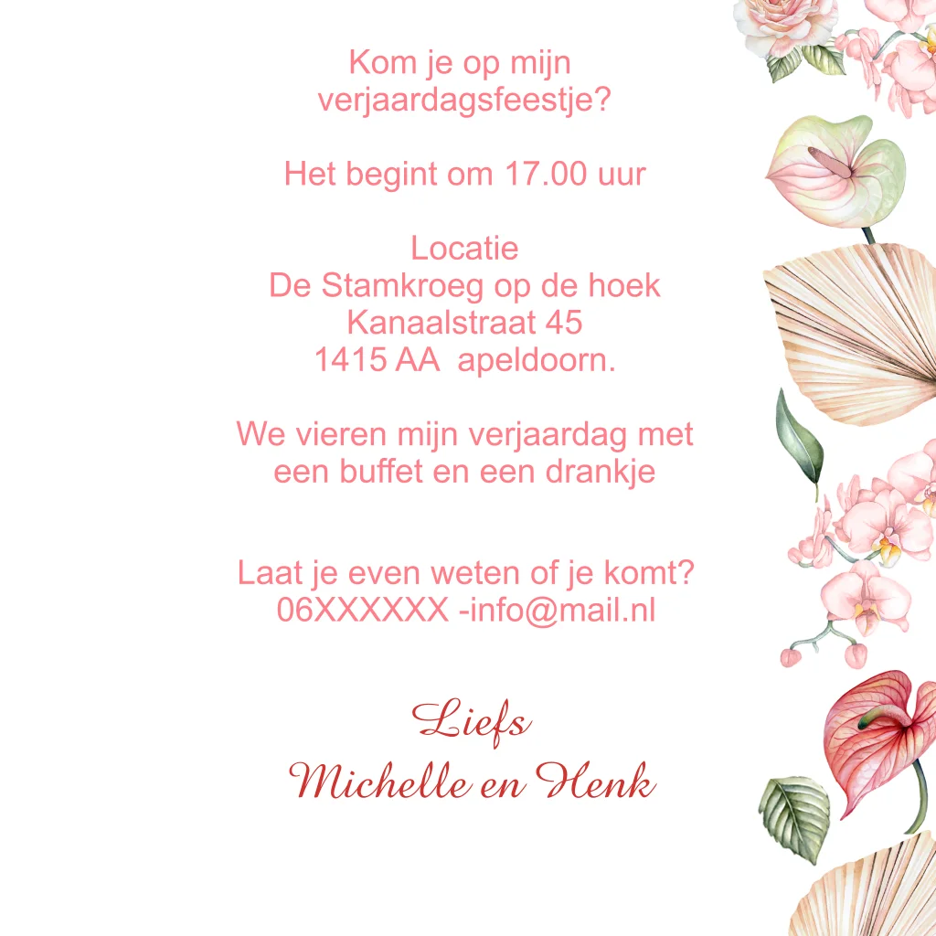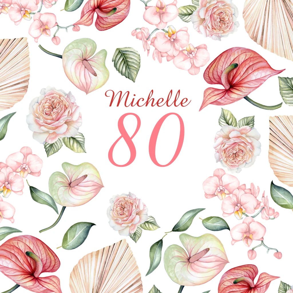 Verjaardagsfeestje 80 jarige vrouw uitnodiging met mooie bloemen in koraalrood en roze aquarel. (20846)