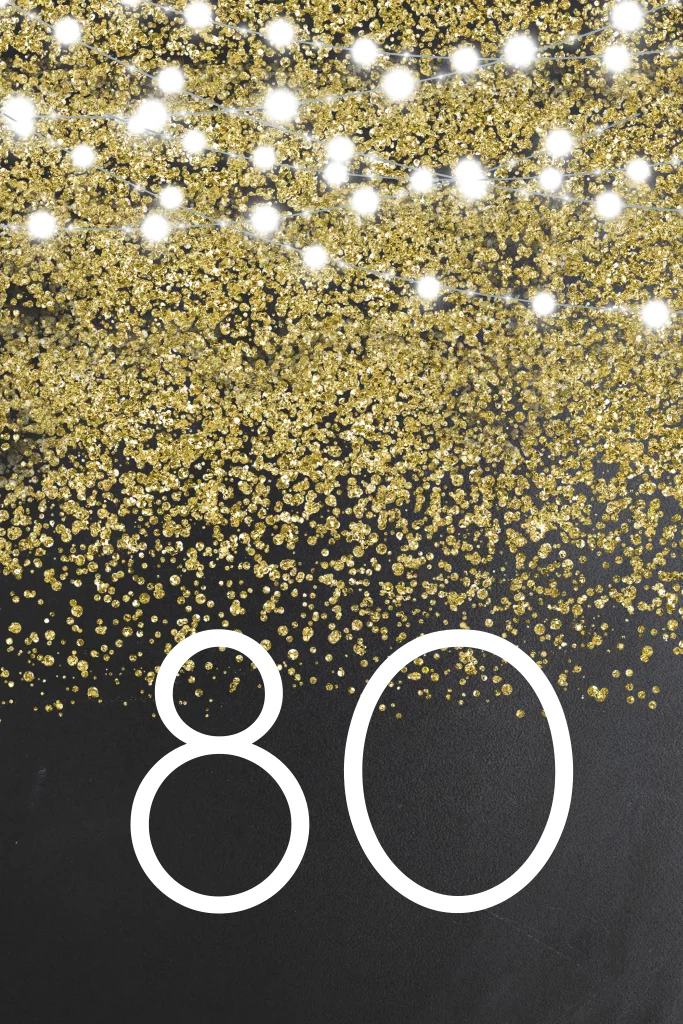Luxe Uitnodiging 80 jaar met gouden glitters op krijtbord