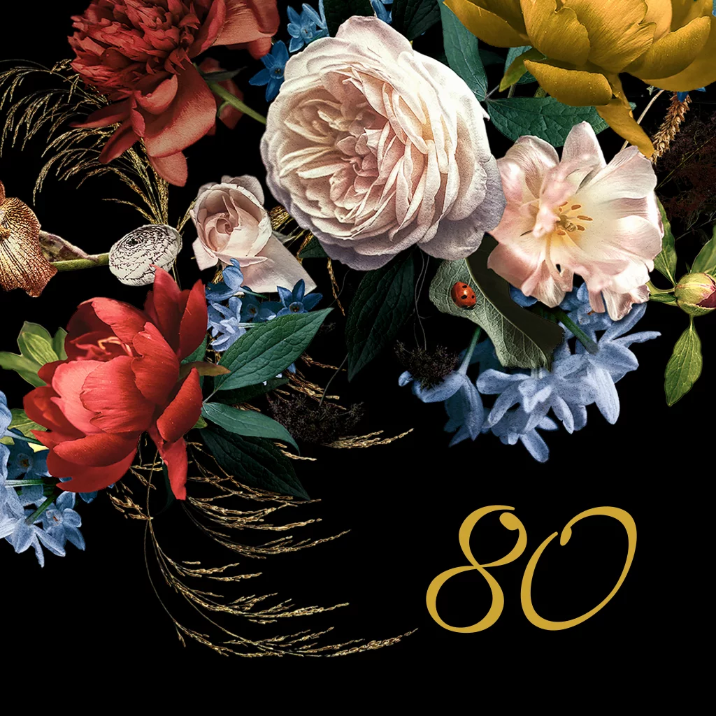 Uitnodiging 80 jaar met bloemen en goudfolie druk