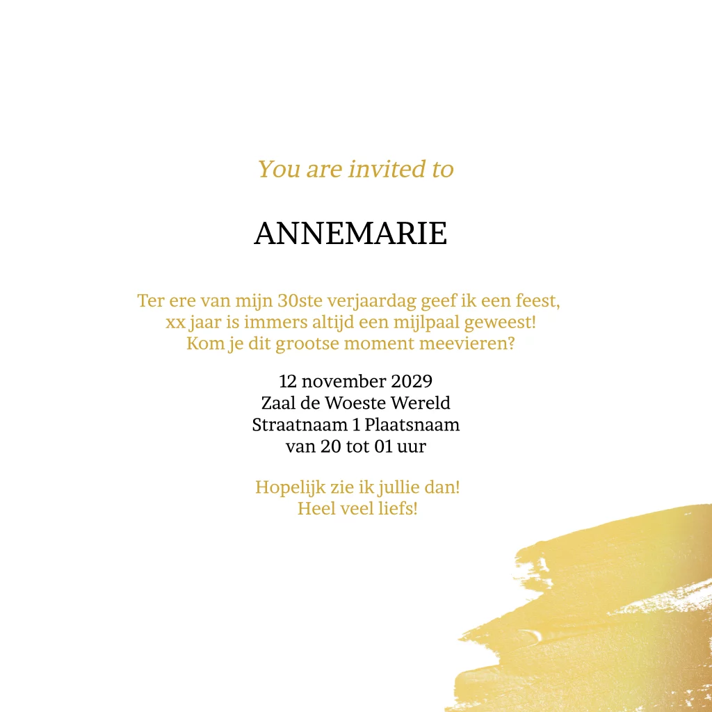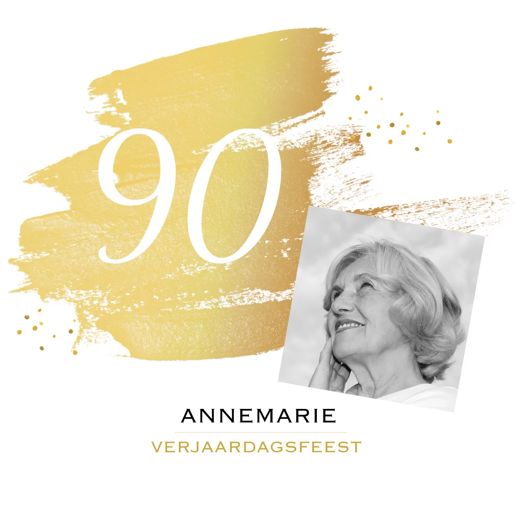 Uitnodiging 90e verjaardag goud tinten confetti streep en foto