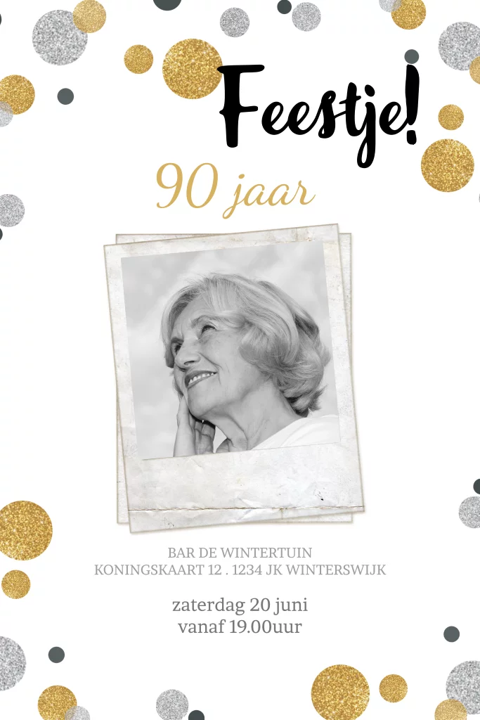 Uitnodiging 90e verjaardag met confetti in zilver en goudlook en foto, teksten zijn geheel aanpasbaar. (5298)