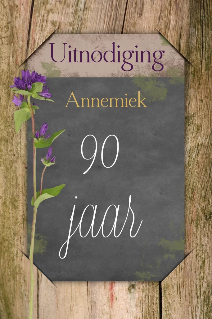 Uitnodiging verjaardag 90 jaar met een houten bord met bloem. De bloem is schaalbaar en de tekst volledig aanpasbaar. (7475)