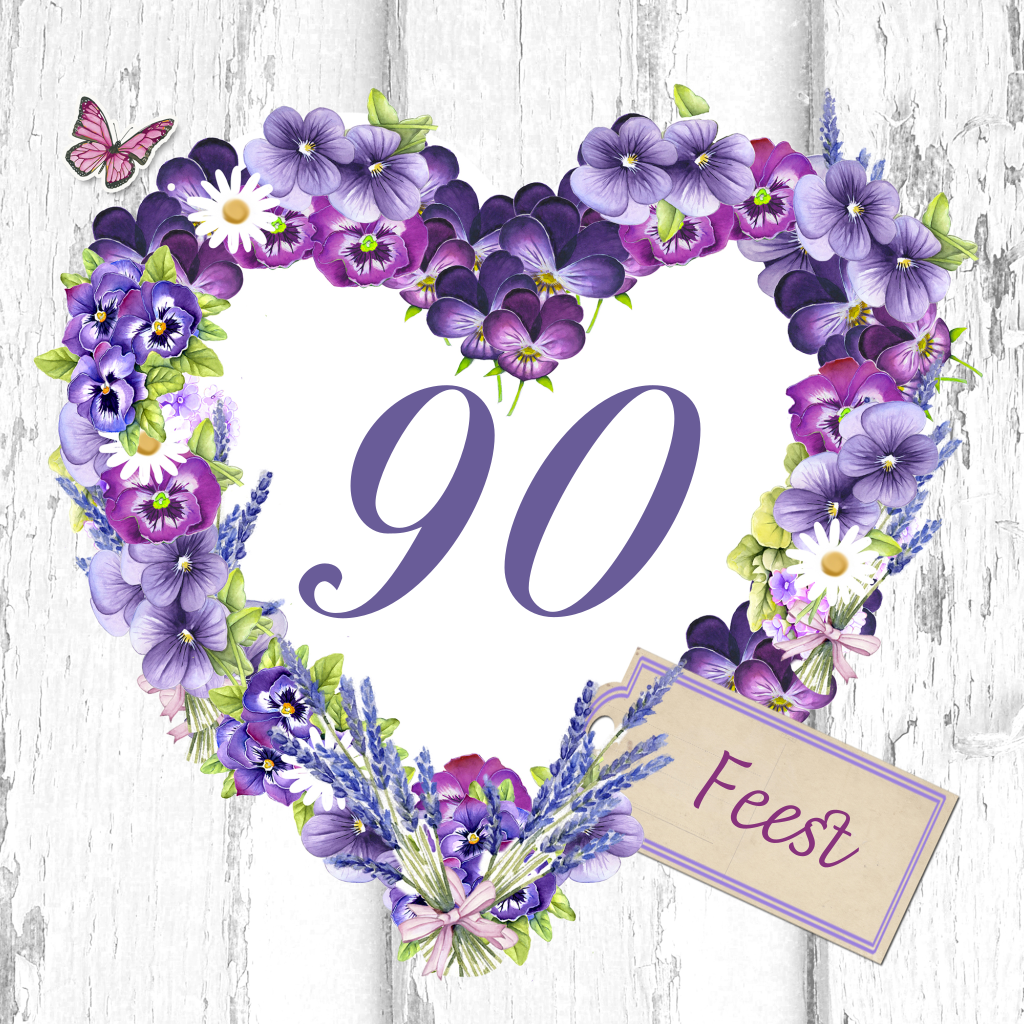 Uitnodiging 90e verjaardag hout met hart van paarse bloemen