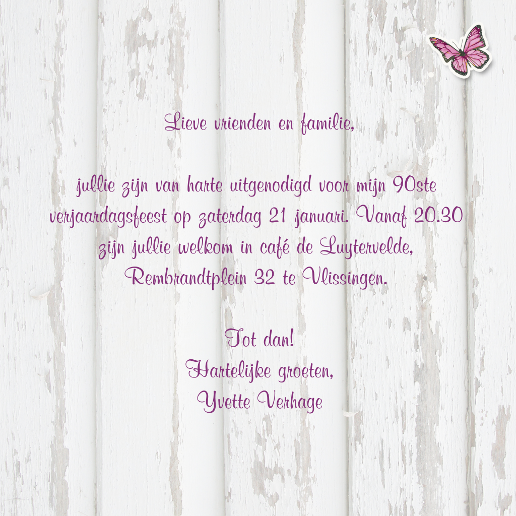 Uitnodiging 90e verjaardag hout met hart van paarse bloemen. Vlindertjes. (720)