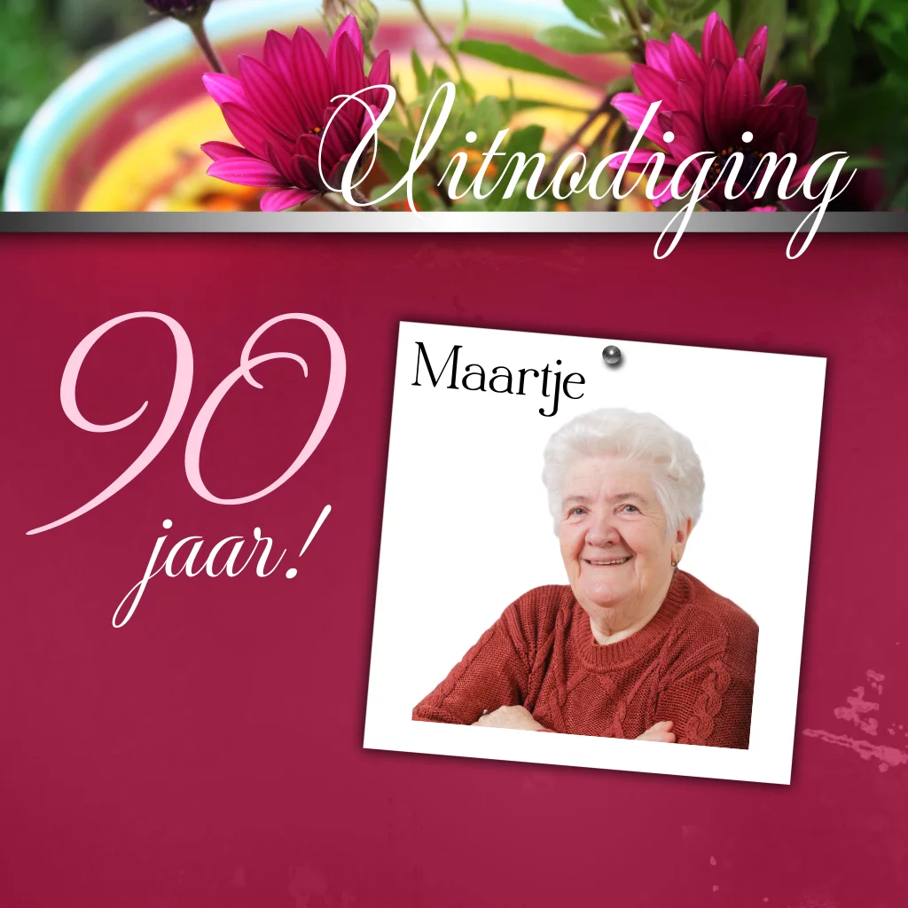 Uitnodigingskaart feestje 90e verjaardag bloemen