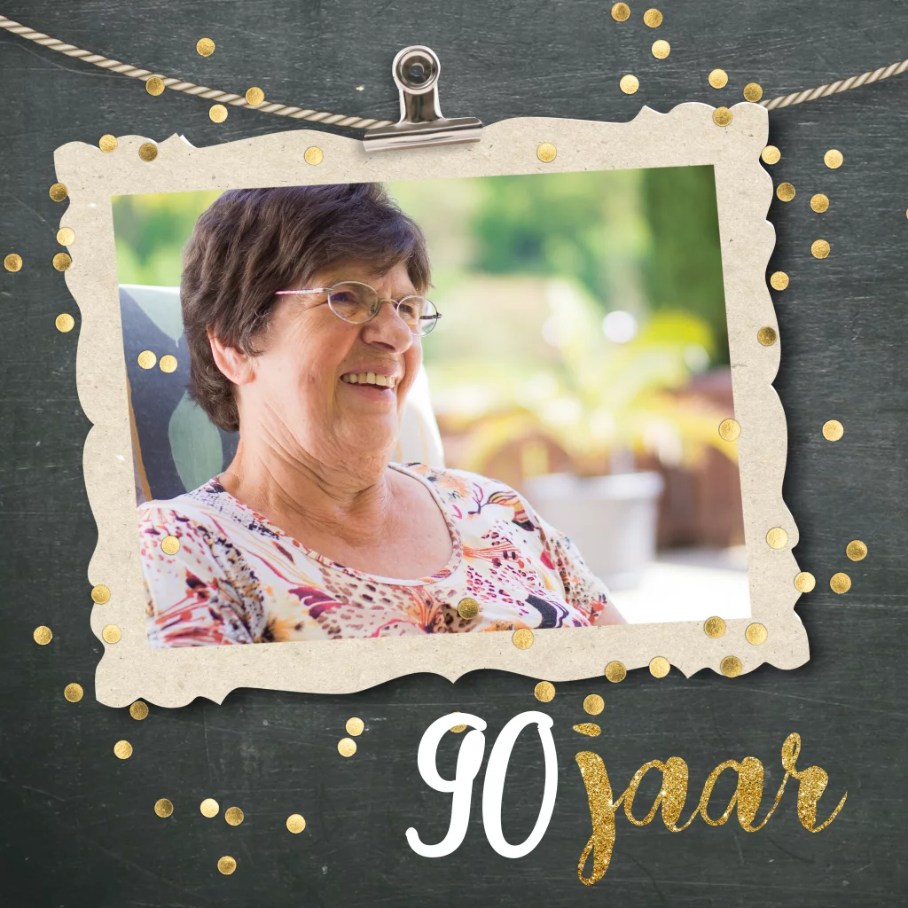 Feestelijke uitnodiging 90 jaar verjaardag met goudkleurige confetti en leuke clip met daaraan jou foto! (6602)