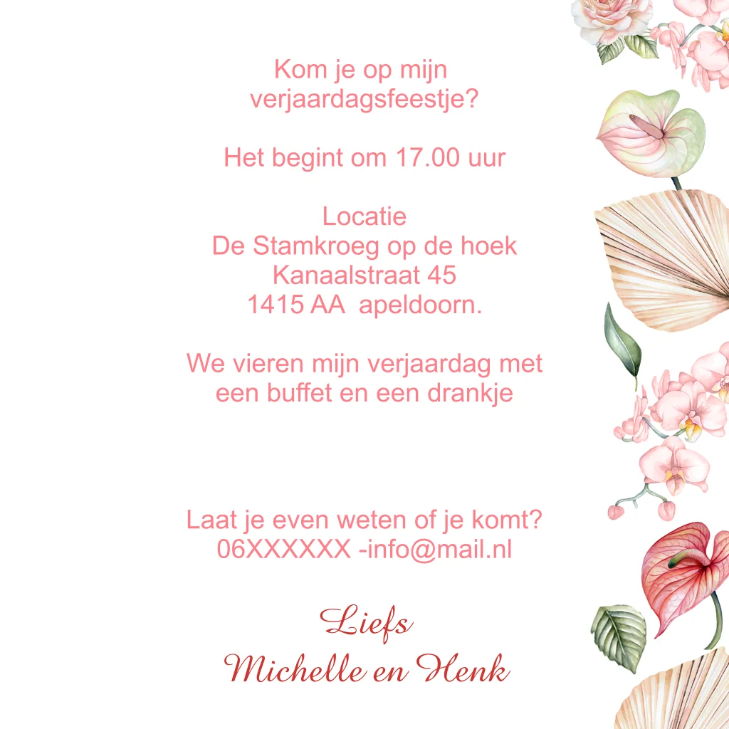90 jaar uitnodiging voor een feestje met mooi getekende bloemen in koraalrood en roze aquarel. (20846)