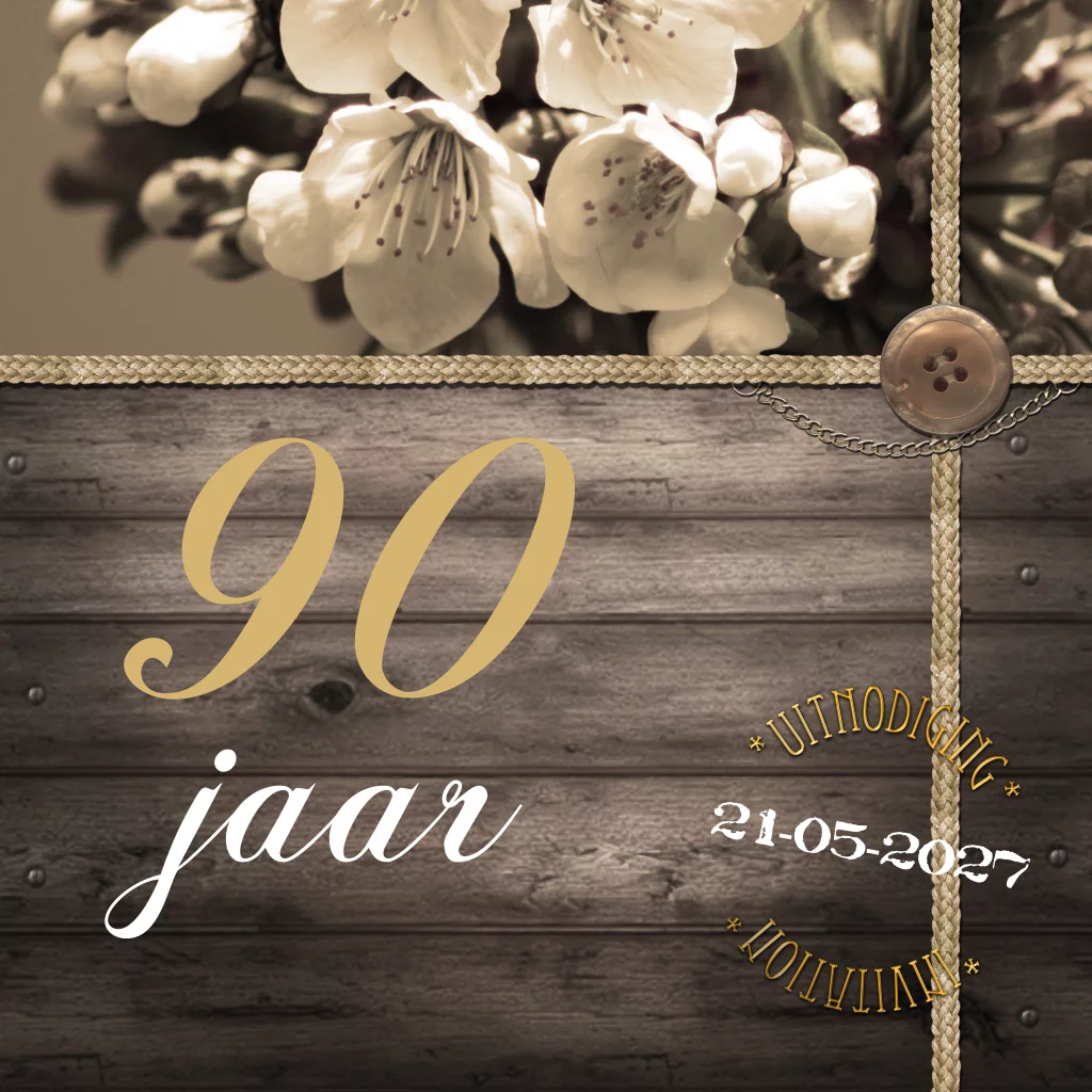 Uitnodiging 90 jaar man verjaardag donker bruin hout en goudkleur en mooie bloemen. (2913)
