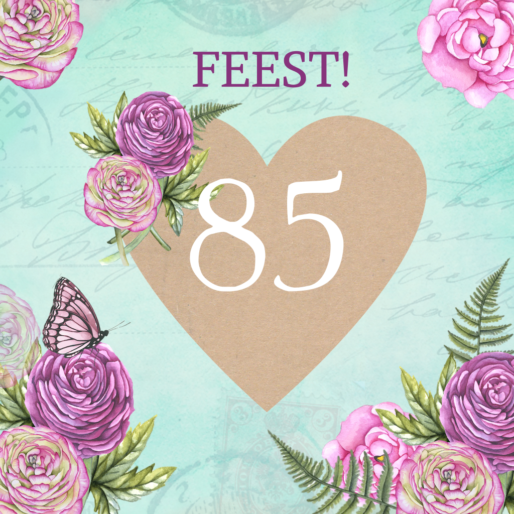 Uitnodiging voor een verjaardagsfeest 85 jaar met hart en versierd met bloemen. (3622)