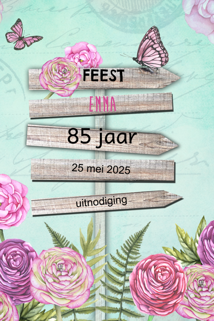 Romantische verjaardagskaart 85 jaar mint groen met roze bloemen en wegwijzer. (3609)