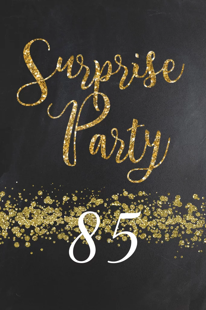 Surprise party 85 jaar met gouden glitters op krijtbord
