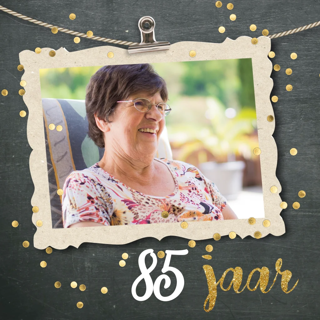 Maak deze feestelijke 85 jaar uitnodiging met goudkleurige confetti en leuke clip met daaraan jou foto! (6602)