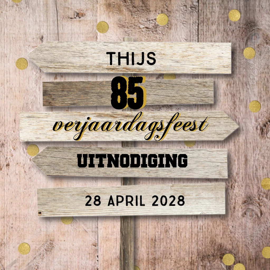 Uitnodiging 85 jaar verjaardag met houten bord en confetti