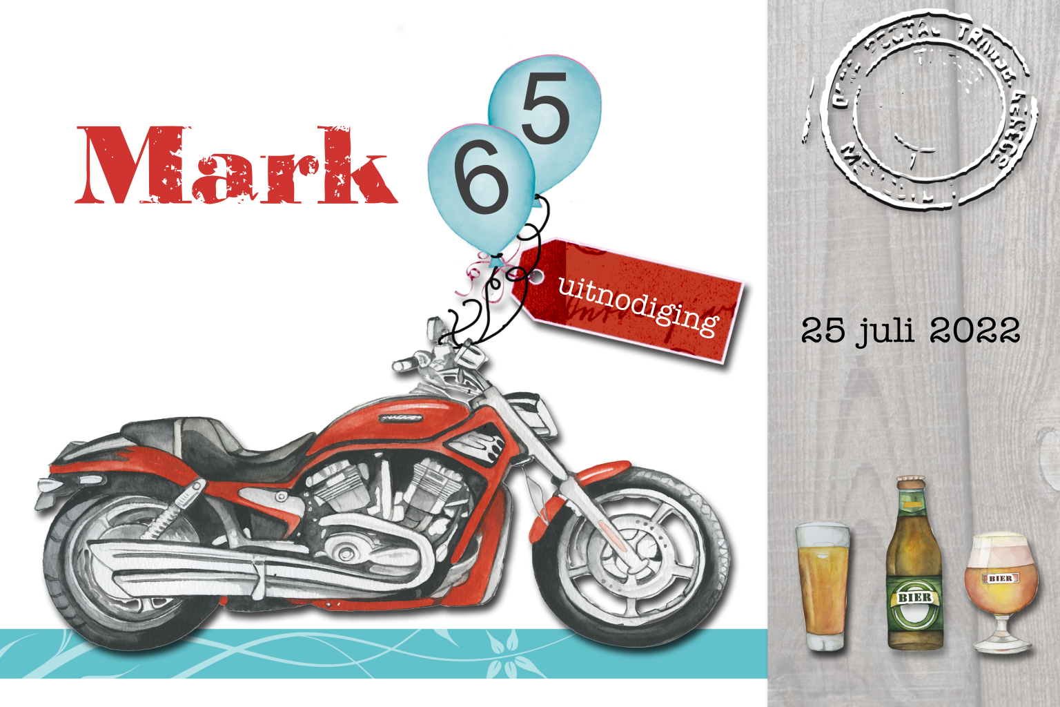 Verjaardagskaart feest 65 jaar met stoere motor en bier. Biertjes en ballonnen. (733)