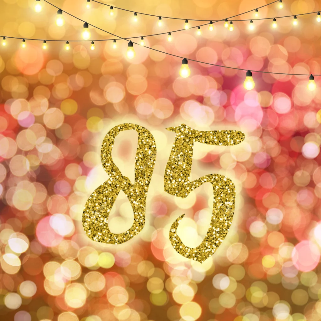 Een lieve en romantische verjaardagskaart voor een 85e verjaardag. Goudkleurige glitter slingers en lichtslingers maken het een feestelijk geheel. (6539) Wil je een ander jaartal in dezelfde stijl op de kaart? Kijk bij afbeeldingen > cijfers of neem contact met ons mee. We zetten dit gratis voor je om.
