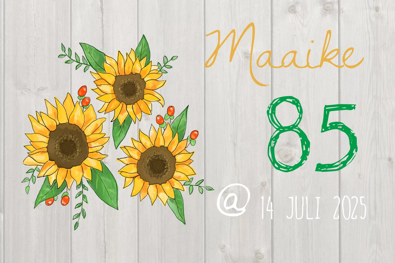 Een frisse 85 jaar verjaardagsuitnodiging met zonnebloemen op hout. De achtergrond is naar wens aan te passen/te verwijderen in onze kaartenmaker. (7465)