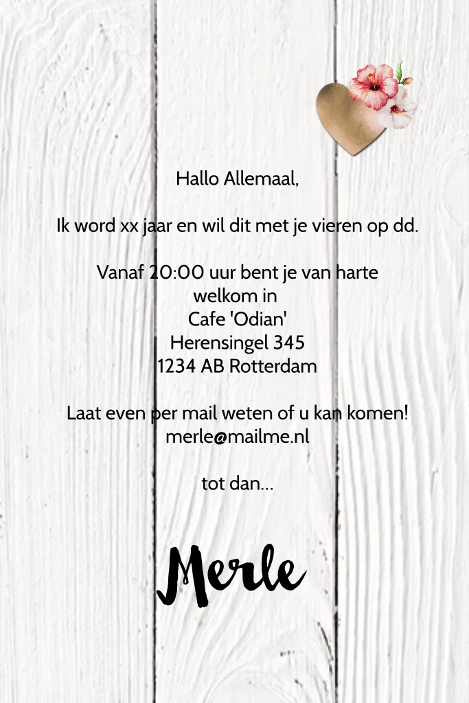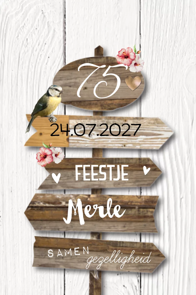 75 jaar verjaardag uitnodigen feestje houten wegwijzer bord vogel en bloem. Op de ondergrond een witte hout soort. (3286)