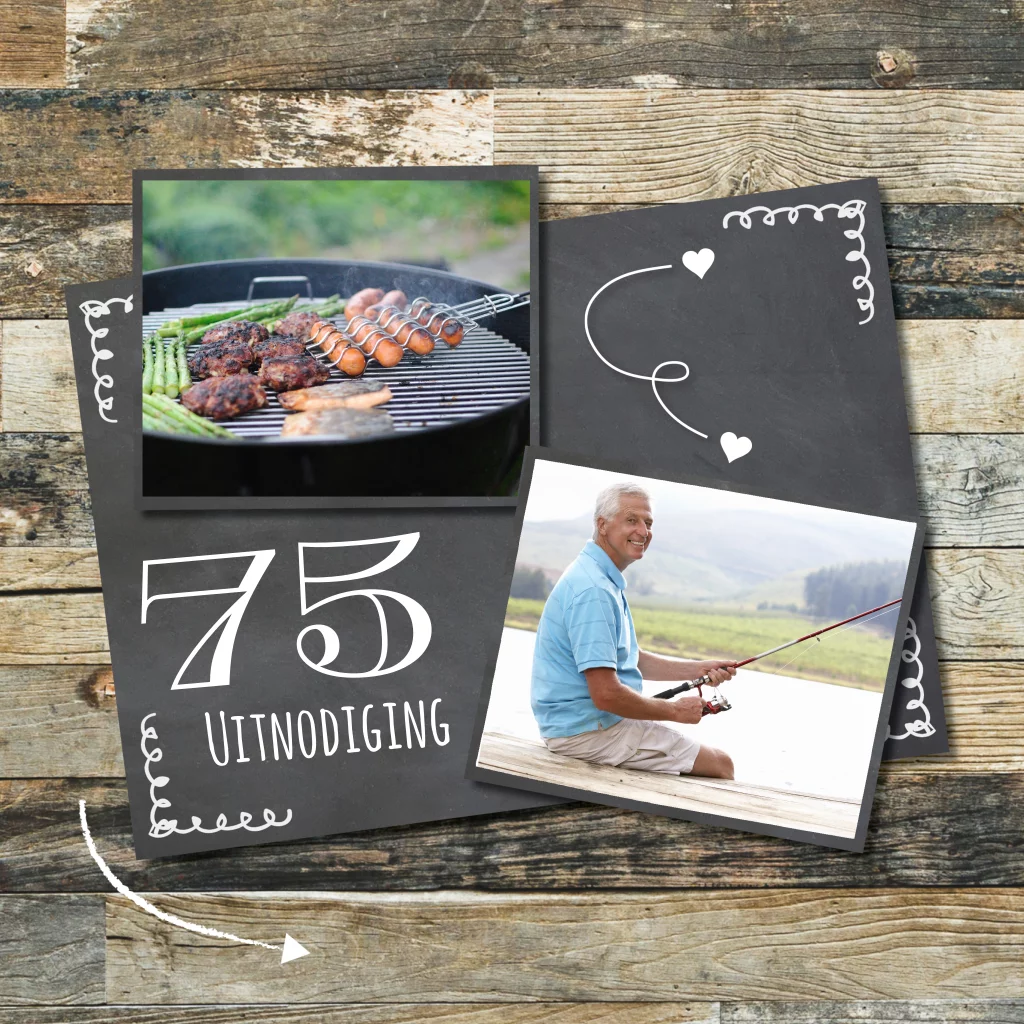 Hippe foto collage uitnodiging vijfenzeventigste verjaardag. Met ruimte voor een foto van vroeger en van nu. (1732)