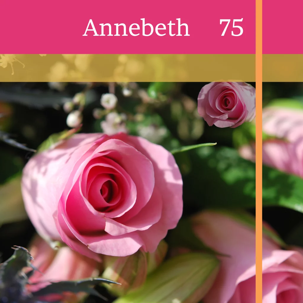 Stijlvolle uitnodiging voor vijfenzeventigste verjaardag roze met goudkleurige balk en een roos in het midden. (499)