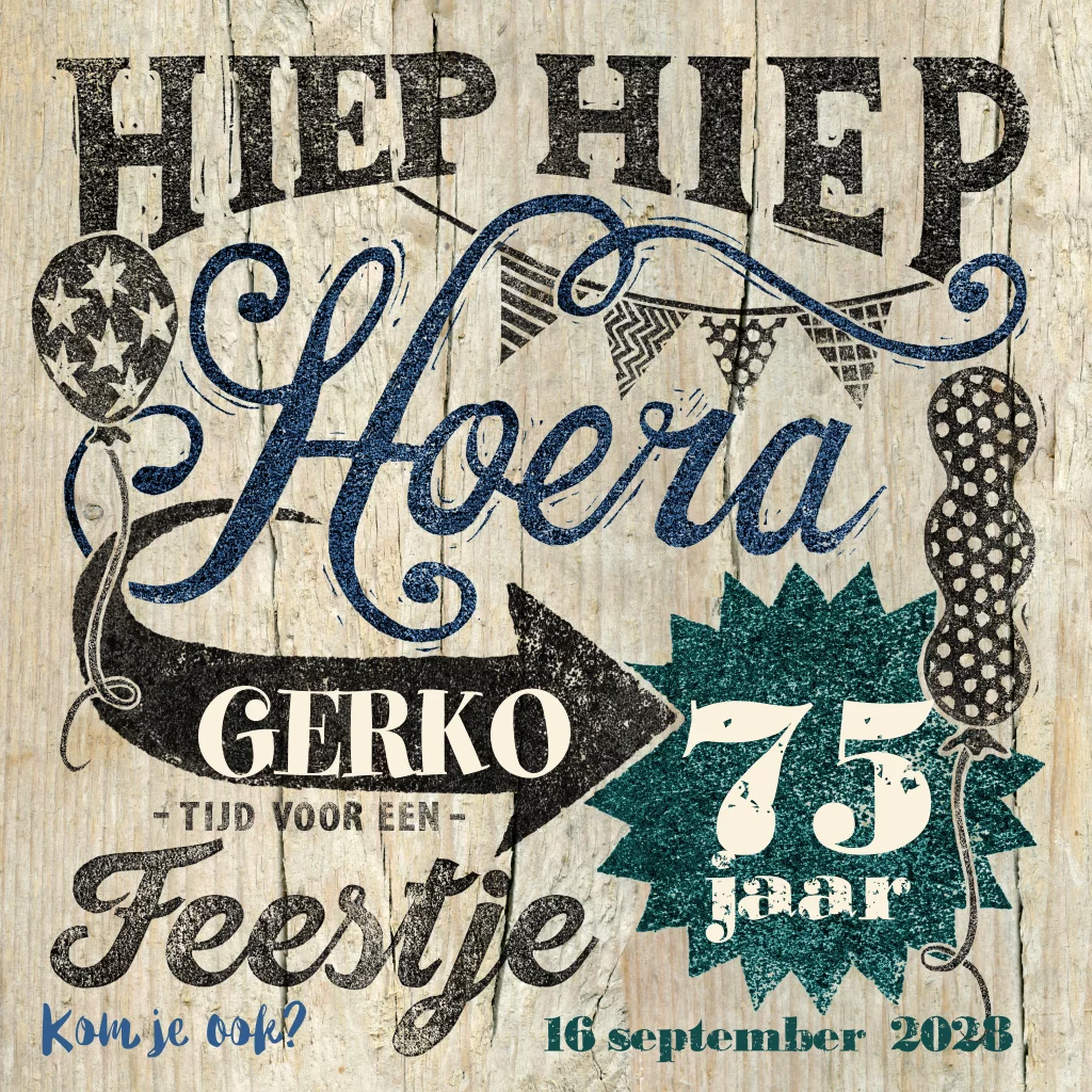 Stoere verjaardags uitnodiging 75 jaar op hout met stempels