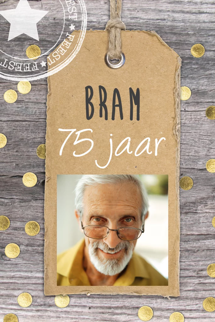 Uitnodiging 75 jaar verjaardag feest met hout en goudkleurige confetti. Op de geprinte label is ruimte voor een eigen foto, maar het kan ook zonder foto. (5879)