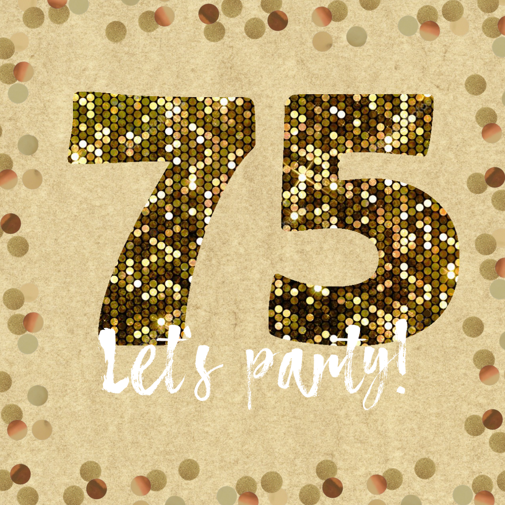 Uitnodiging verjaardag 75 jaar met goudkleurige glitters. Combineer deze kaart met de gouden envelop voor een extra feestelijke uitnodiging. (7680)