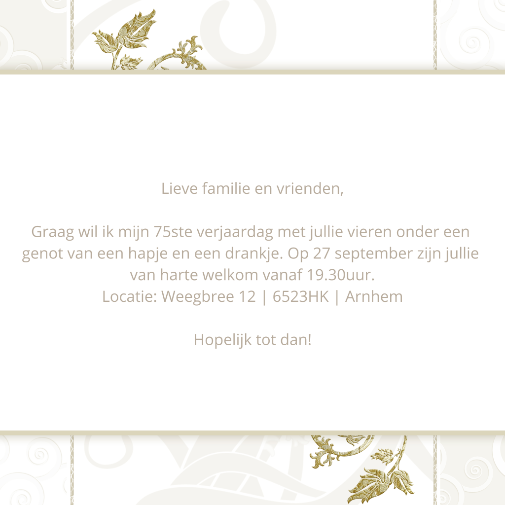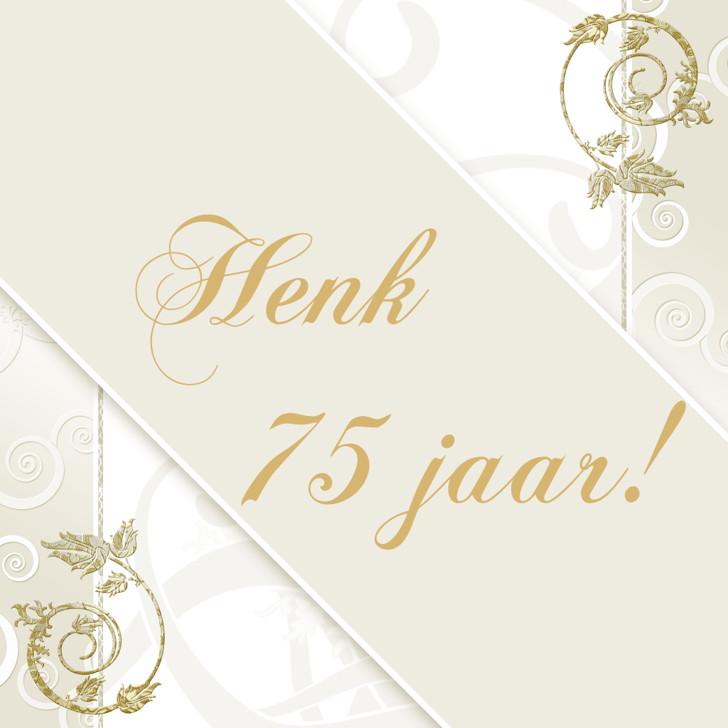 Uitnodiging feest vijfenzeventigste verjaardag met schuine vlakken en goudkleurige versiering. (660)