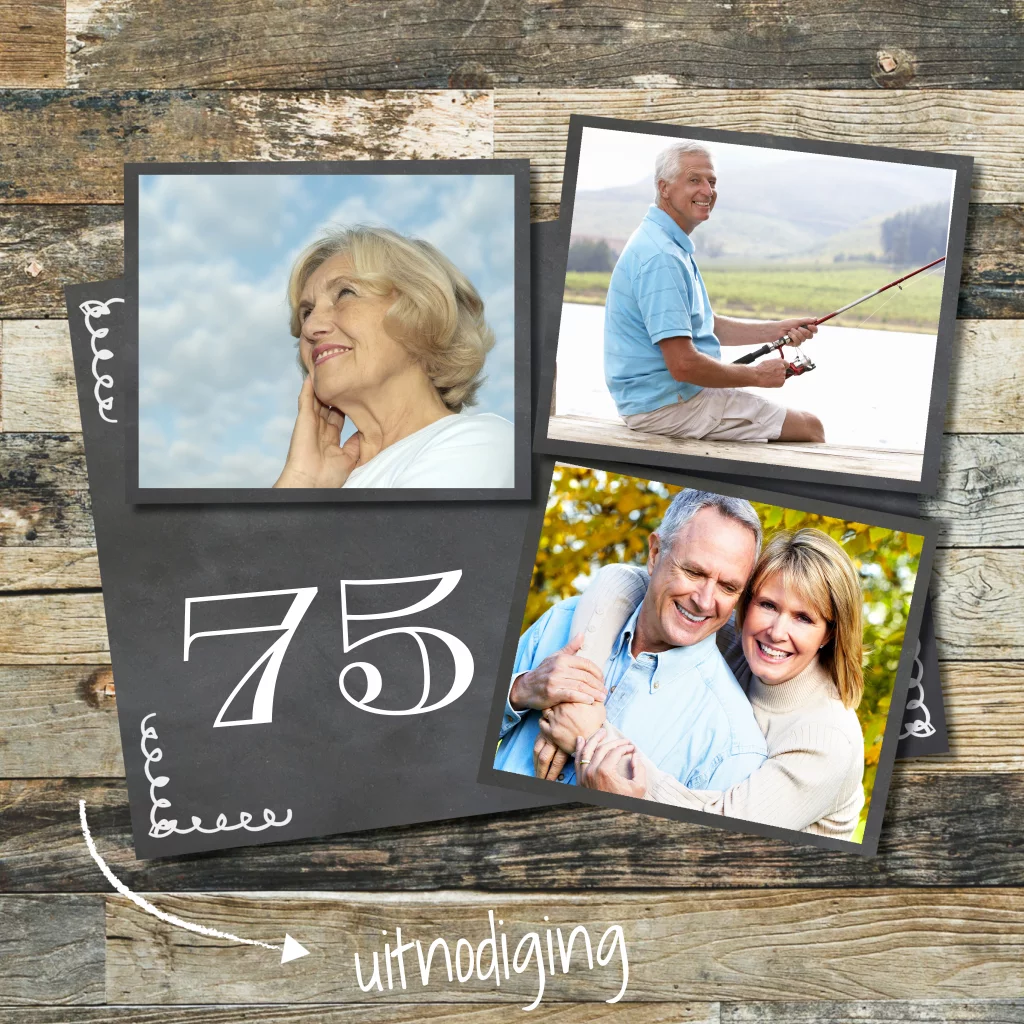 Trendy uitnodigingskaart vijfenzeventigste verjaardag (1731) met fotocollega van 3 foto's