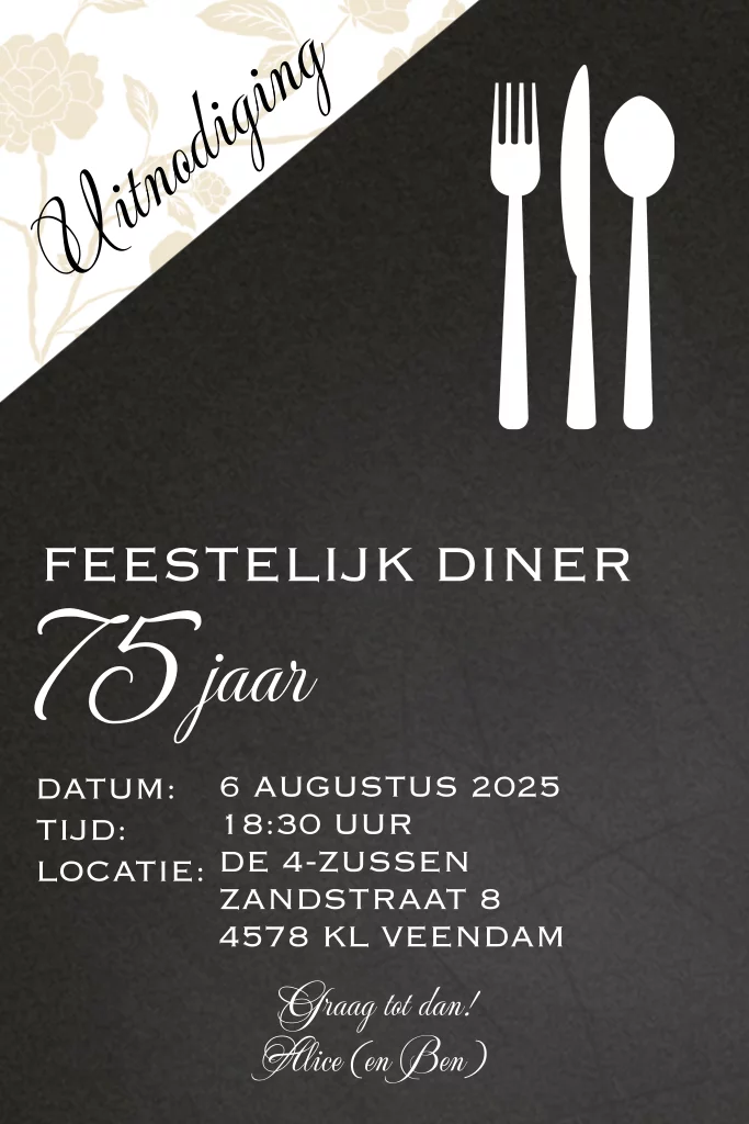Uitnodigingskaart diner etentje 75 jaar verjaardag