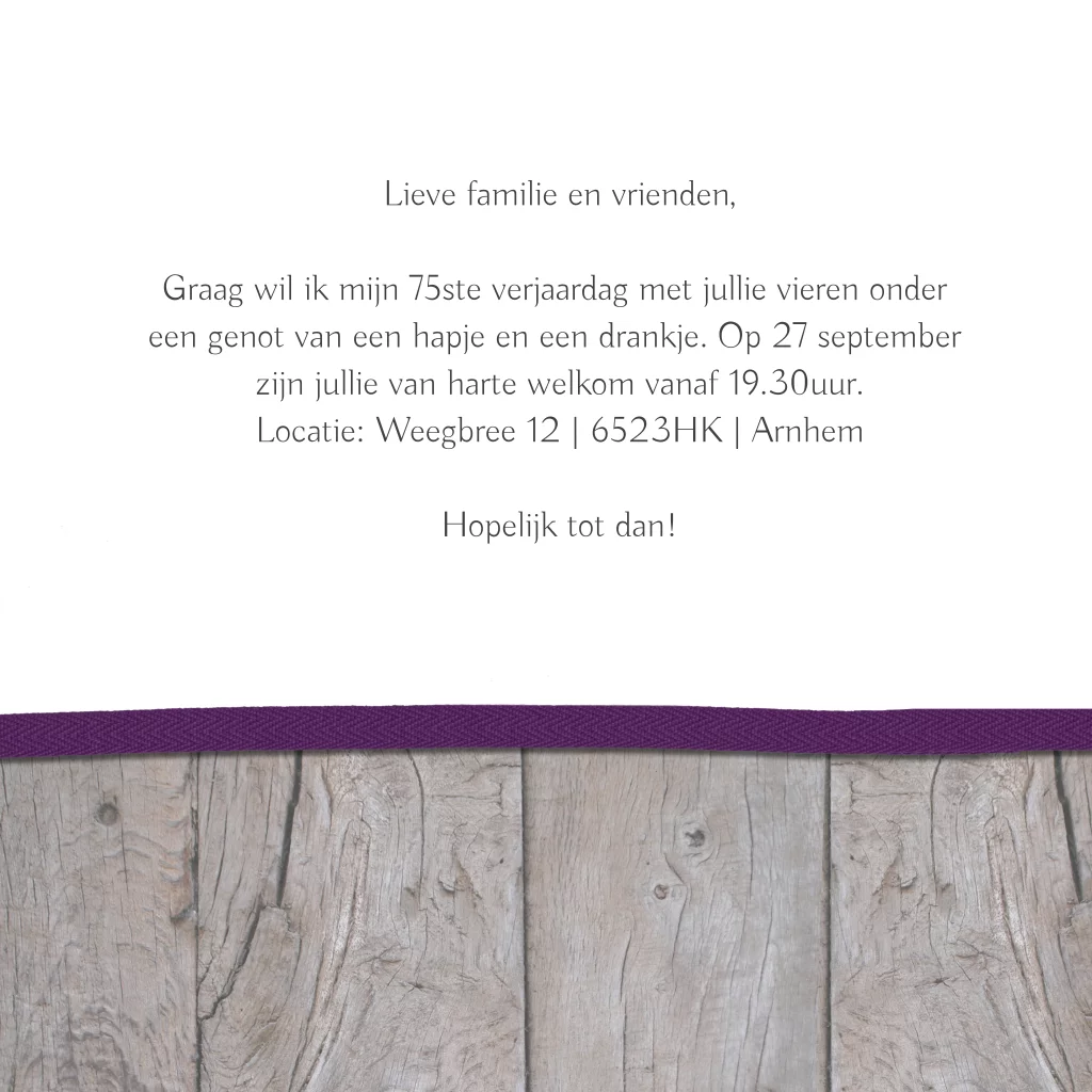 Verjaardag 75e jaar uitnodiging sloophout met rood en paars