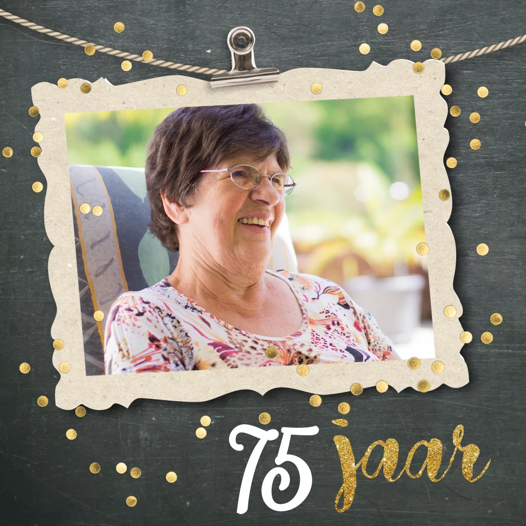Feestelijke 75 jaar uitnodiging met goudkleurige confetti en leuke clip met daaraan jou foto! (6602)