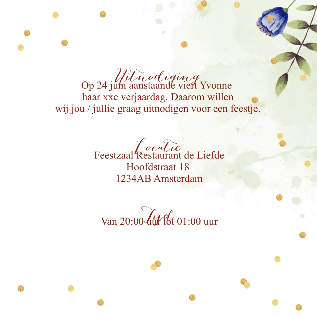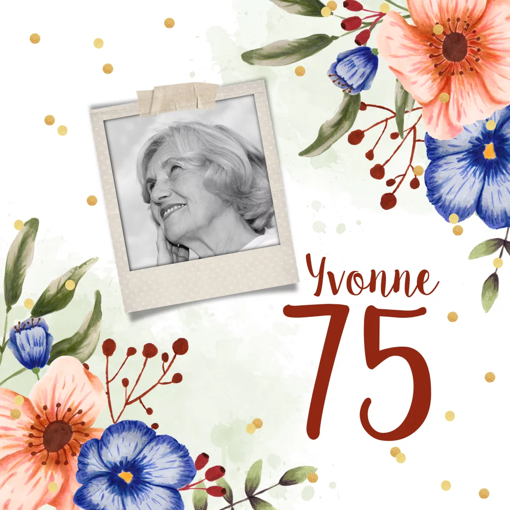 Uitnodiging voor een 75 jarig verjaardagsfeest, met bloemen, aquarel, confetti en eigen foto. (7090)