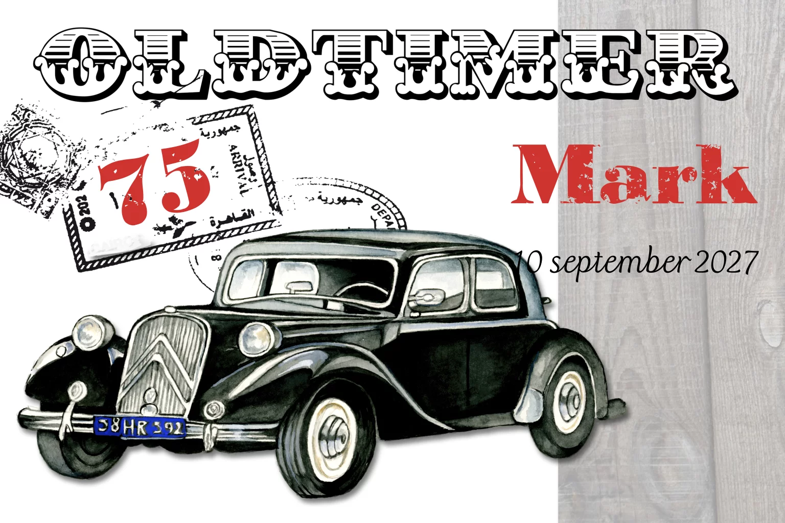 Uitnodiging verjaardagskaart feest 75 jaar met oldtimer. Grijs hout aan de zijkant. Leeftijd aan te passen. (732)
