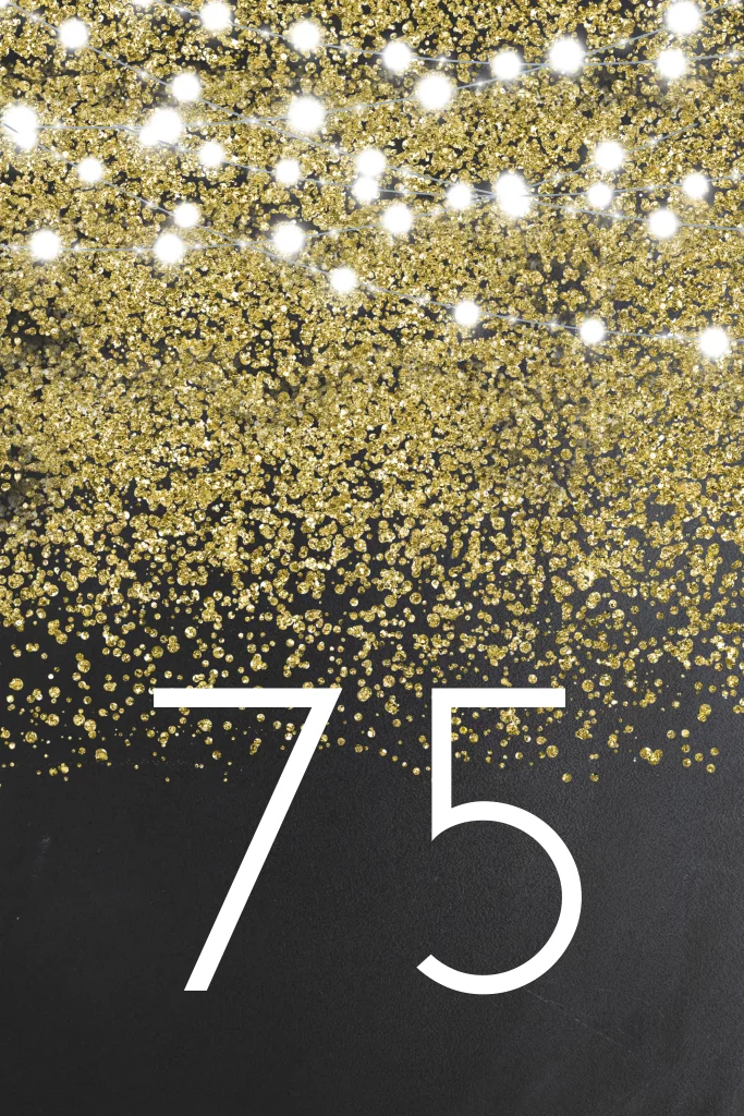 Uitnodiging verjaardag 75 jaar met goudkleurige glitters op krijtbord. (7139)
