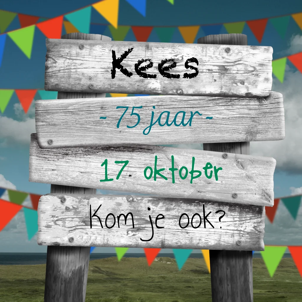 Uitnodiging vijfenzeventigste verjaardag met houten bord met vlaggen eromheen.