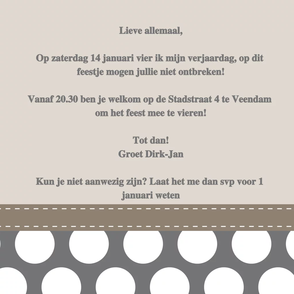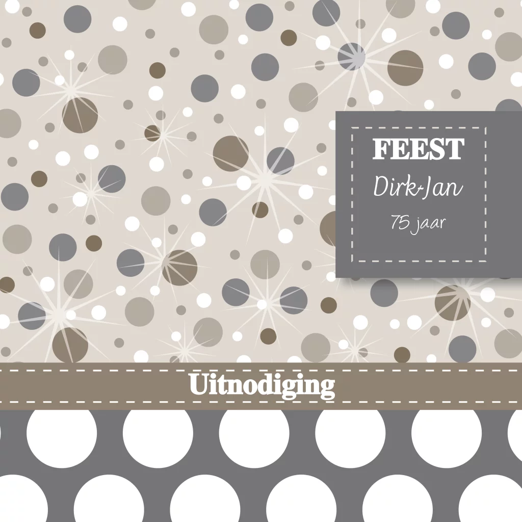 Hippe uitnodiging 75ste verjaardag met stippen op een grijs met taupe achtergrond.