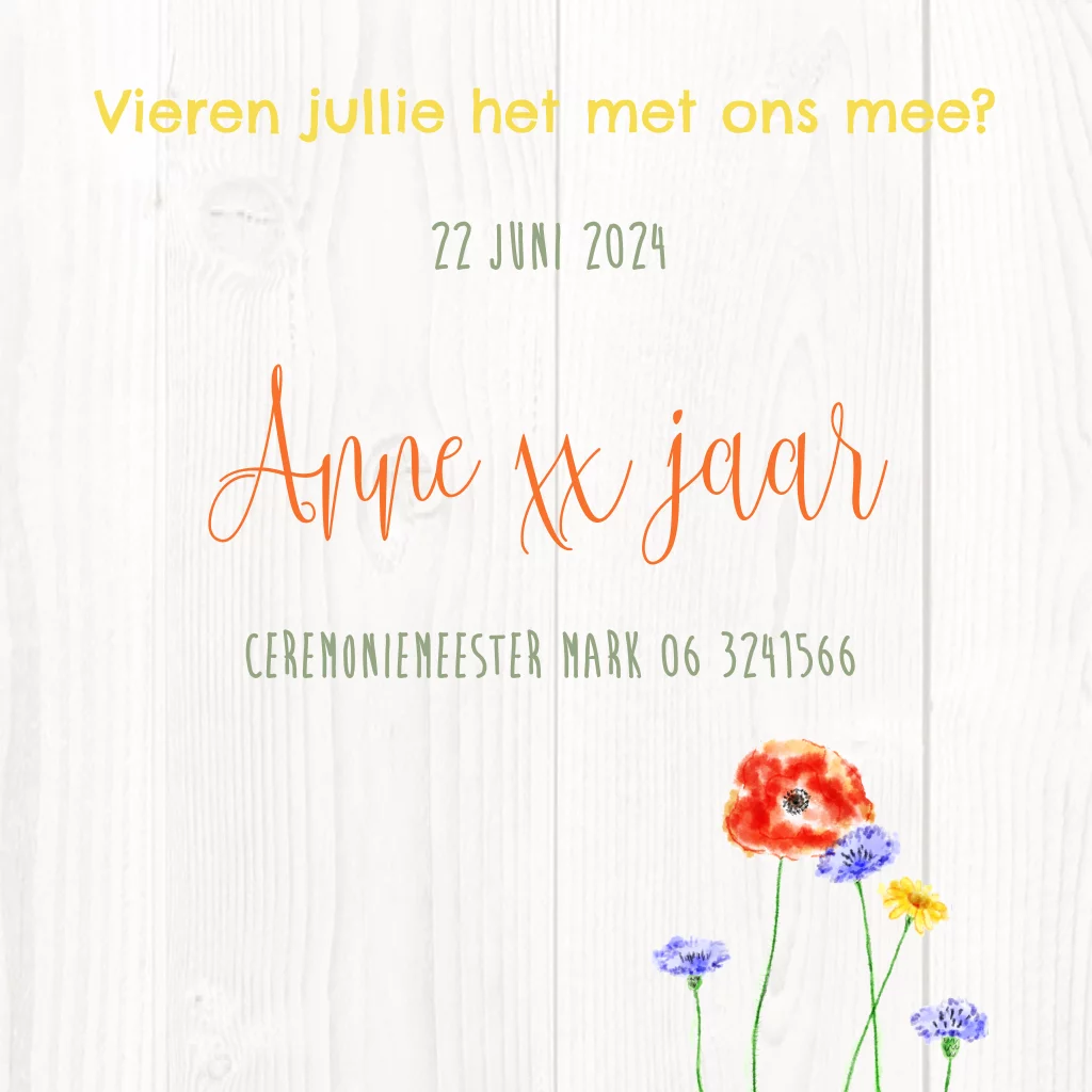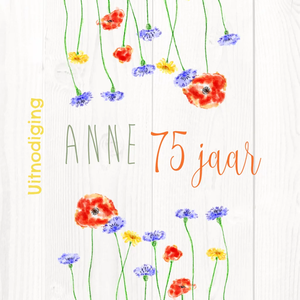 Een uitnodiging 75 jaar om te gebruiken als uitnodiging voor een feestje met veldbloemen in aquarel op hout voor een 75 jarige. (7084)