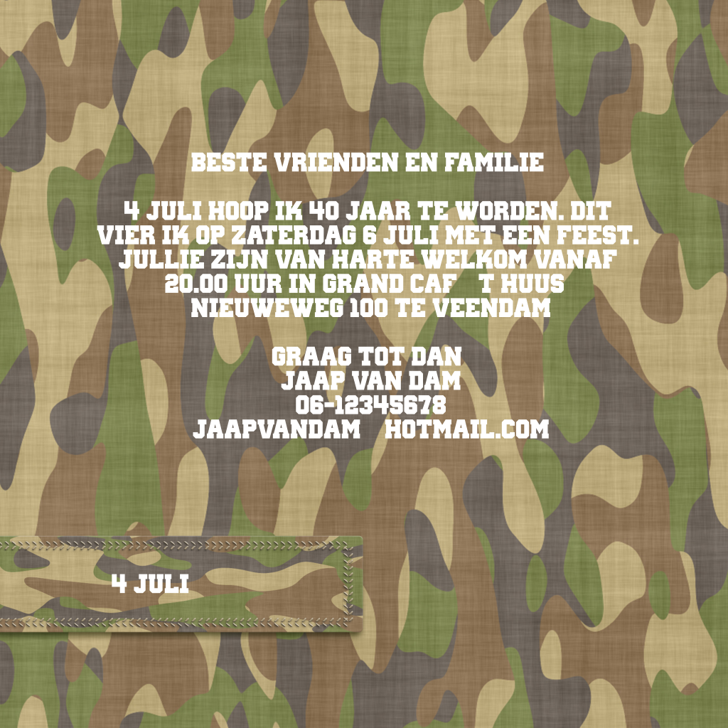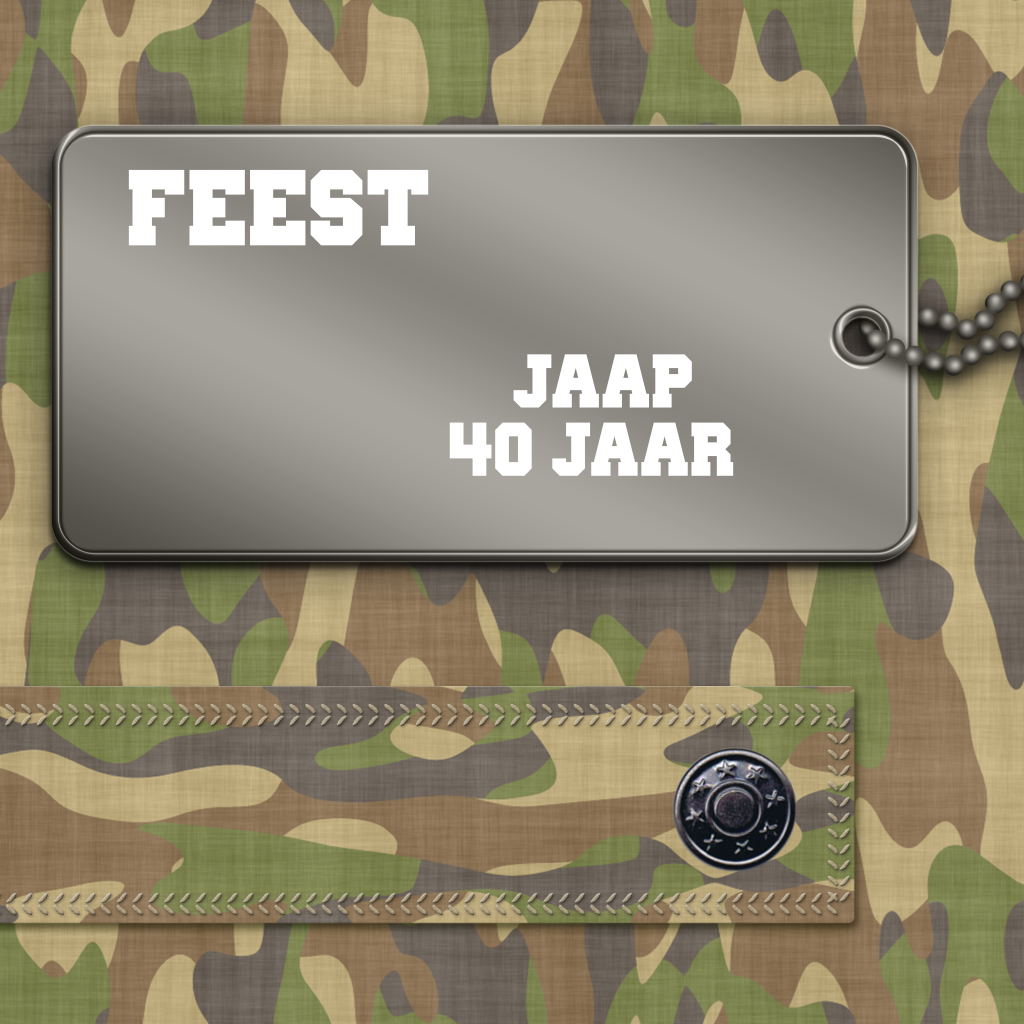 Uitnodigingskaart verjaardag feest leger print groen bruin man. Zilver naamplaatje. (532)