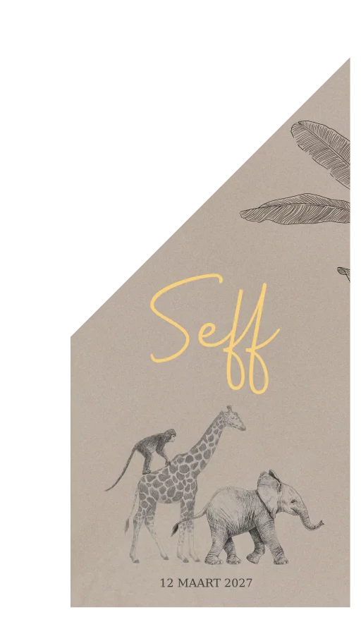 Geboortevlag voor een jongen met naam voor buiten in een jungle thema. (22646) Het jungle thema zorgt voor een avontuurlijke en speelse uitstraling, met afbeeldingen van schattige dieren zoals een giraf, en ollifant.