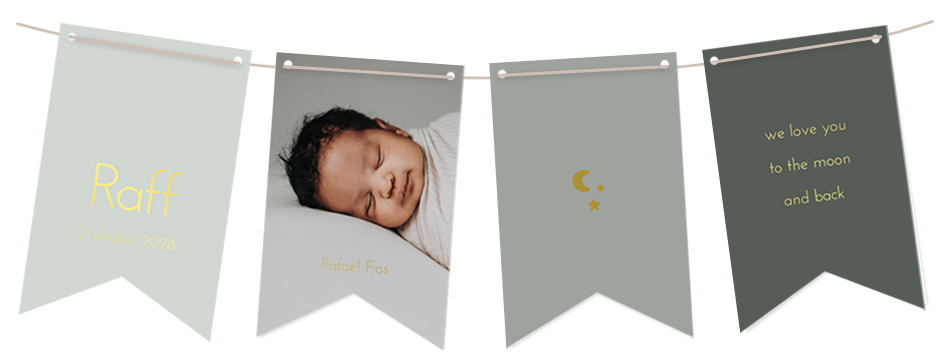 Let op: De vlaggetjes worden los geleverd en kun je naar wens met een touwtje of lintje aan elkaar verbinden. Zo heb je een eigen unieke geboorteslinger. De touwtjes zijn apart bestelbaar.